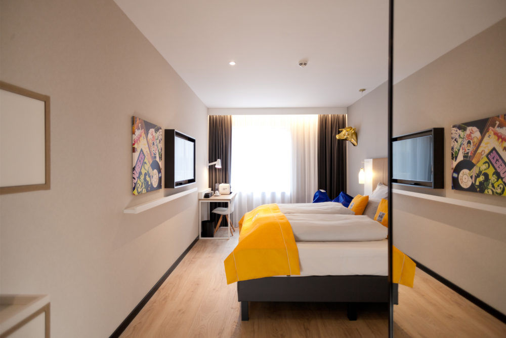 Have you ever seen a golden cow? WARA realized the decorations of hotel NIU Dairy in Haarlem. The building used to be an old dairy factory, formerly known as De Sierkan 2019. This historical element is the source of inspiration for the name of the hotel, but also for the decorations. Because of the hotels proximity to pop venue De Patronaat, the musical theme also plays an important part in the concept. Apart from framing old LPs, we also produced colorful wallpaper which we used to decorate halls, toilets and other public areas